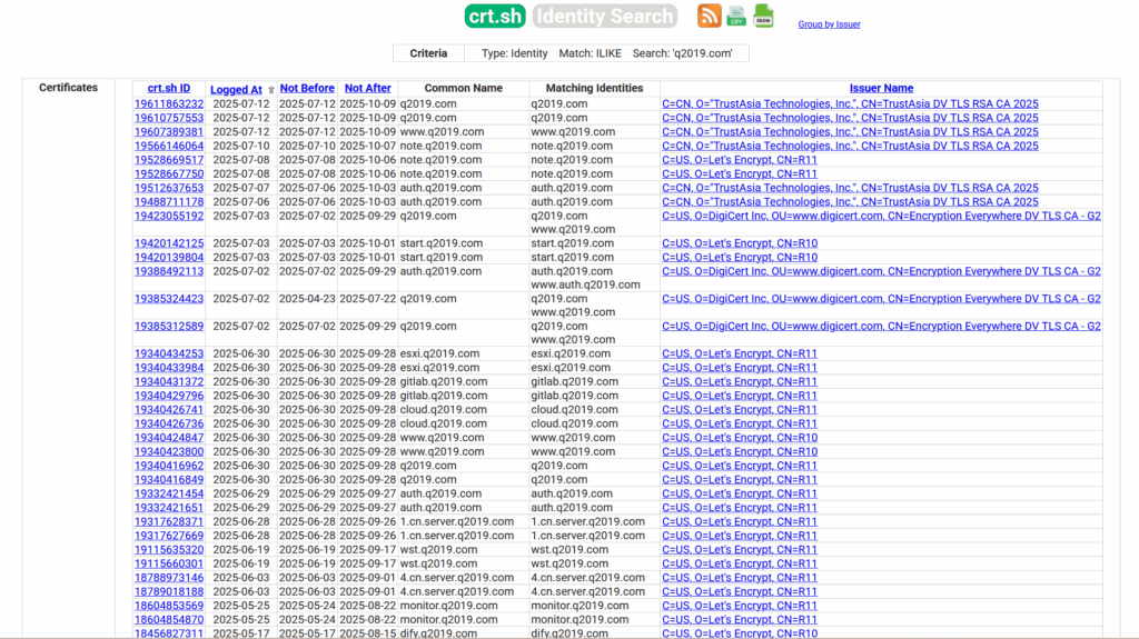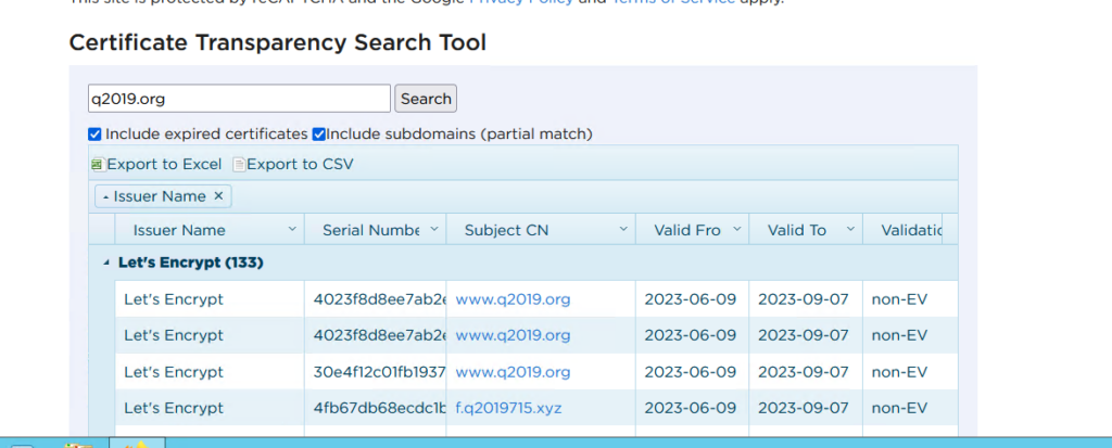 直接往输入框中输入你想要查询的域名,比如本站的两个域名q2019.com以及q2019.org,直接回车(当然你也可以选择是否查询过期了的证书以及子域名),结果如下图
