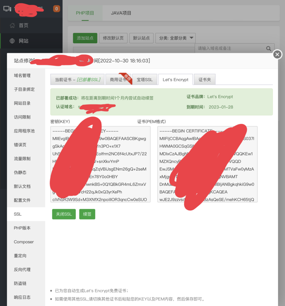 创建新的网站很简单,并且支持多网站共存(实在是懒人一大利器),上传完网站代码文件便可安装,操作比较符合用户直观感受。还有注意一下其自带了lets encrypt证书签名组件,不需要安装certbot等之前一大堆麻烦的事情,直接点按几下就搞定了。