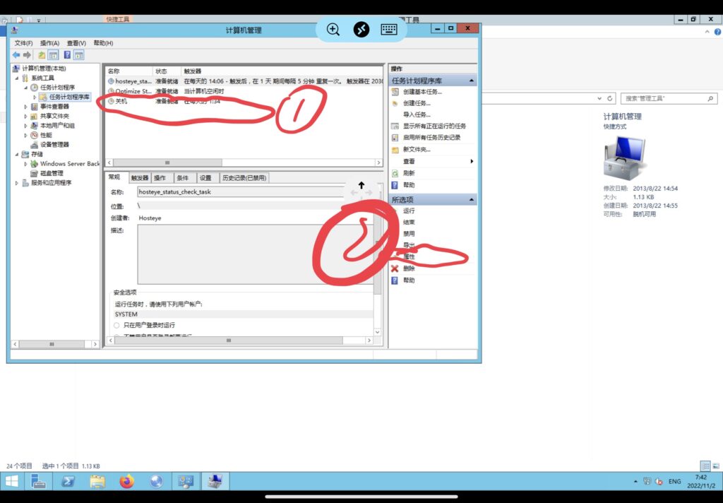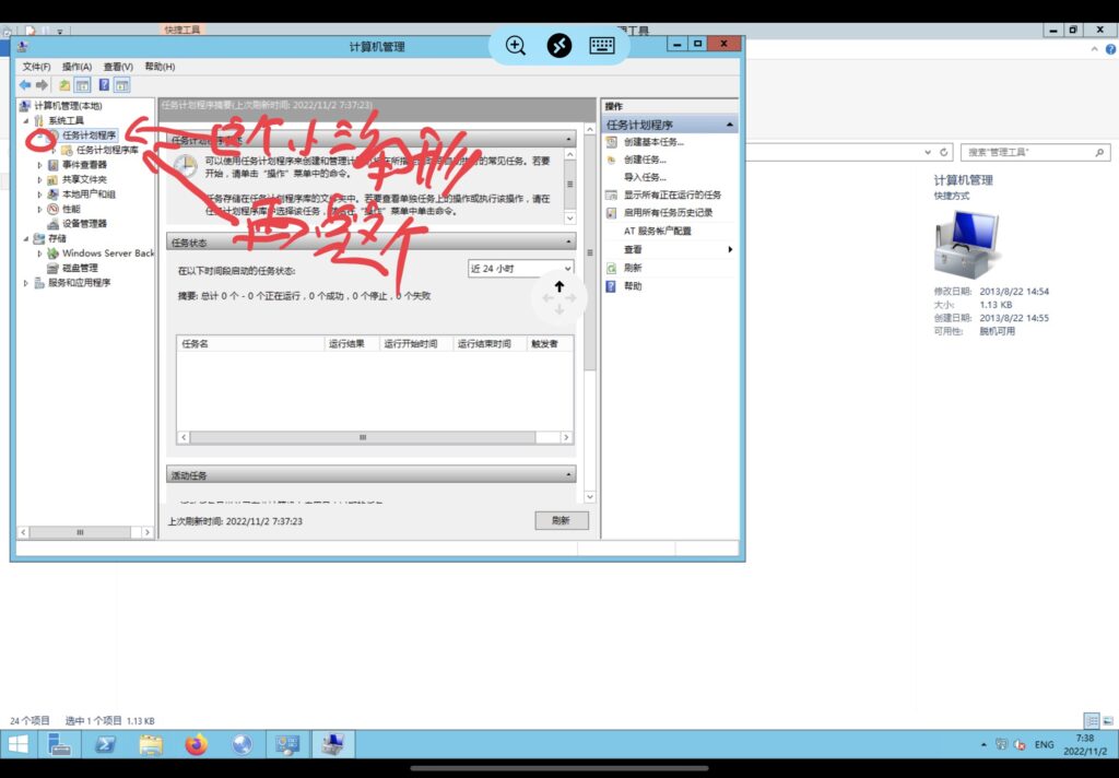 当然,班上电脑的计划任务比我电脑的计划任务多的多(高老师,班上电脑可能会卡顿一小段时间,这个界面没有响应,耐心等待即可,),需界面显示出来以后选中你要更改的计划任务名称(to 高 老师,班上电脑自动关机的任务名称叫做 关机。 得往下滑动一下,这个任务没记错的话应该在这个框的最底下),点中更改的任务计划,在点击右侧边栏的属性按钮.。当然,假如要新添加定时任务点击右侧栏的创建任务即可。