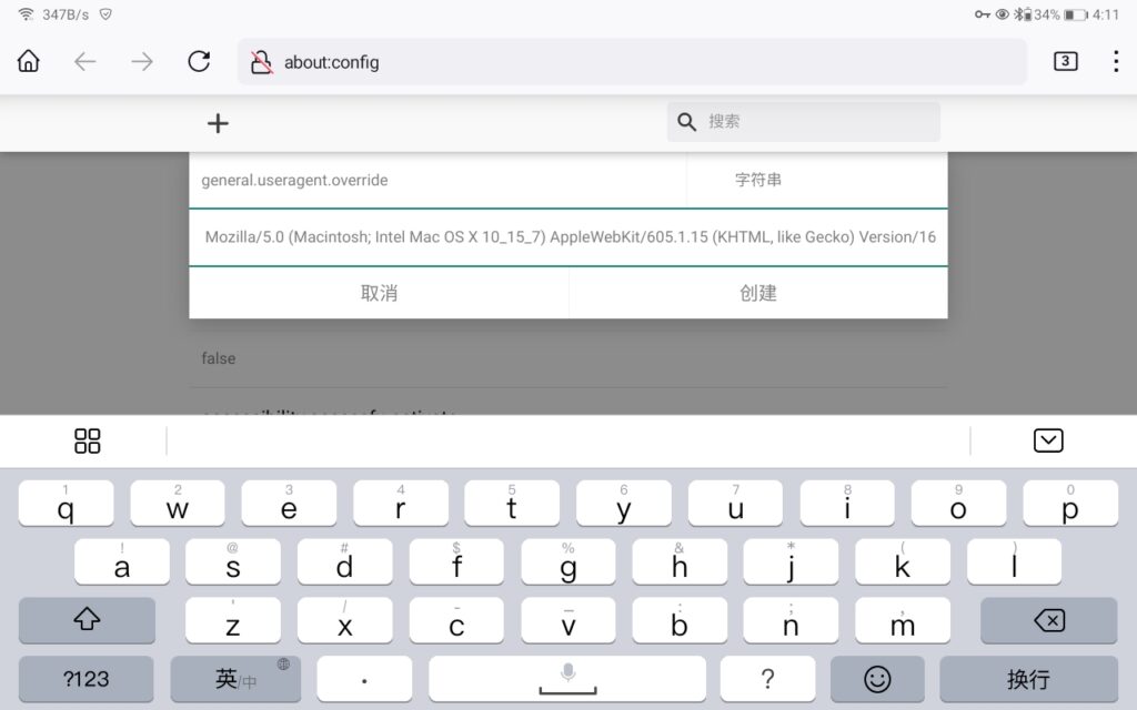 第二步 添加设置 类型 字串符 名称 general.useragent.override