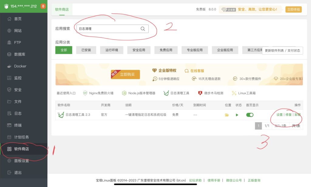宝塔面板环境的数据库日志以及网站的访问日志往往占用了很大的储存(特别是你的网站/服务器访问量较大的时候)这时候就是要清理了,首先先点击左侧面板的软件商城,再点击搜索框,搜索日志清理,搜索出来后点击安装,按照流程安装完后点击图中圈出的设置按钮
