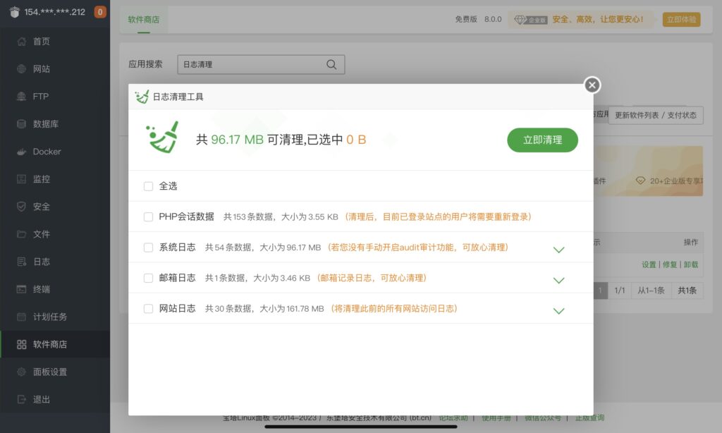 宝塔面板运行的时候本身即会产生一些缓存/垃圾文件,以下是清除方法