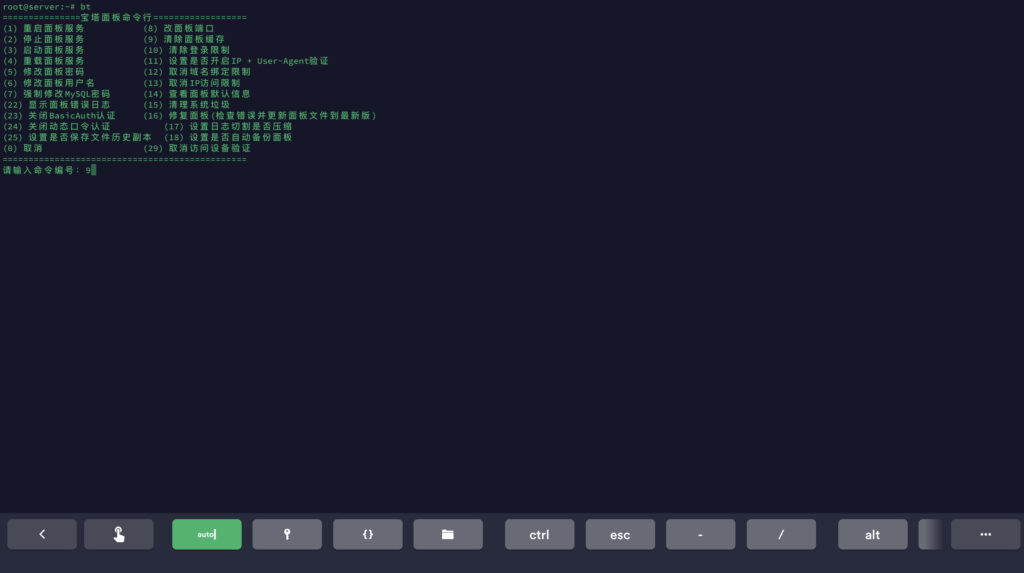 首先以root权限登陆终端,然后输入命令bt,接下来输入9,回车即可,如图
