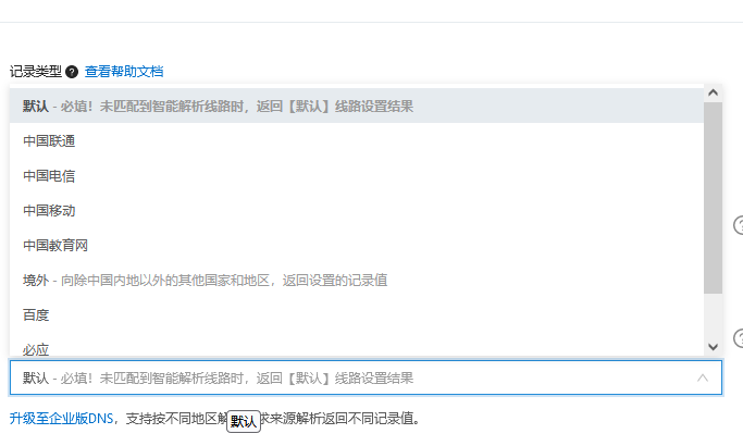 在请求时候,递归域名服务器将会将请求的用户的ip发给上游的dns(假如上游支持的话),这样一层层的到了权威域名服务器,接下来权威域名服务器通过这个ip地址区分地区,网络提供商来返回不同的结果,比如说阿里的云解析dns就支持这个功能,如下图(因为本人穷,没开企业版,只能按线路解析{哭晕})