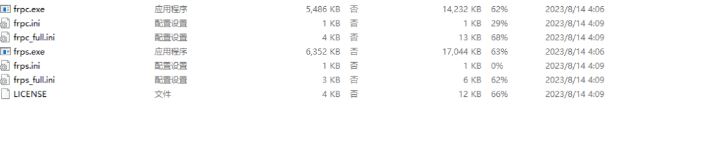 解压出以下的文件,其中 frpc是客户端,我们现在不管,frps是服务端,编辑frps.ini来编辑配置文件