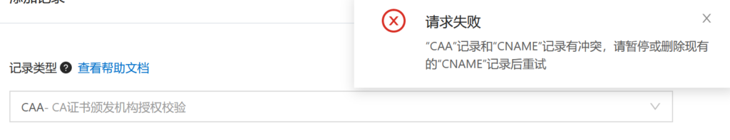 直到返回空值,即没有限制,注意一下啊,cname和caa记录是会有冲突的!即一个子域名不能既有cname而且有caa记录。比如说以阿里的云解析控制台为例子,假如尝试这样做,会出现如下的问题。
