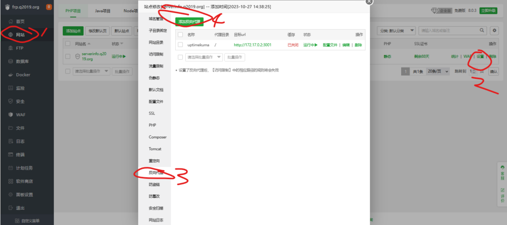 以下反向代理的过程是基于宝塔面板(lnmp)搭建的,其他的环境大同小异,举一反三即可,但是注意,反向代理uptime-kuma需要反向代理程式支持websocket技术