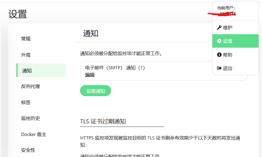 首先这边建议你先填写一下uptime-kuma的通知方式,这样子再检测到服务故障的时候uptim-kuma可以快速通知你。我这边采用邮件通知的形式,点击右上角,然后点击设置,选取通知,再按设置通知,点击设置通知,按照指引设置即可