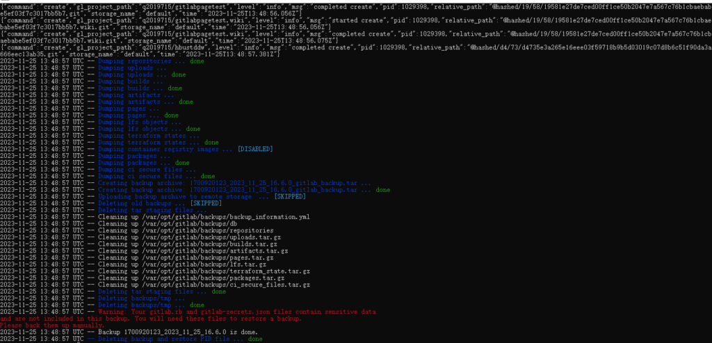 注意一下,就如终端中所说的,由于安全的原因,有一些文件并没有被包含在备份文件之中,我这里是 gitlab.rb和gitlab-secrets.json;这两个文件,我们可以手动复制并且备份一下