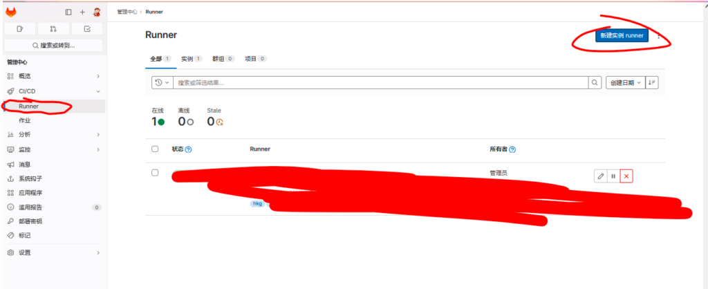 然后再你的gitlab实例之中前往管理中心>CI/CD>runner>新建runner