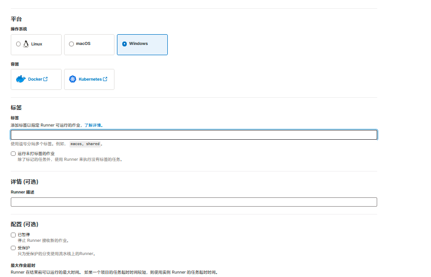 然后在新建的界面选中windows,然后记得填写runner的标签(必须填写不然无法创建),点击创建