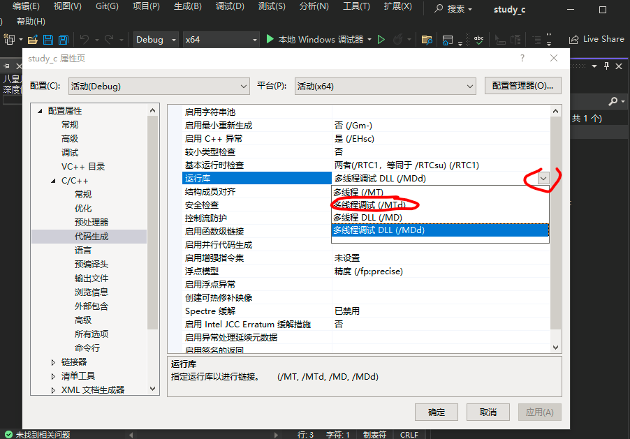 然后修改运行库选项,现在为“多线程调试DLL(MDd)模式”,我们将其调整为“多线程调试(/MTd)”模式