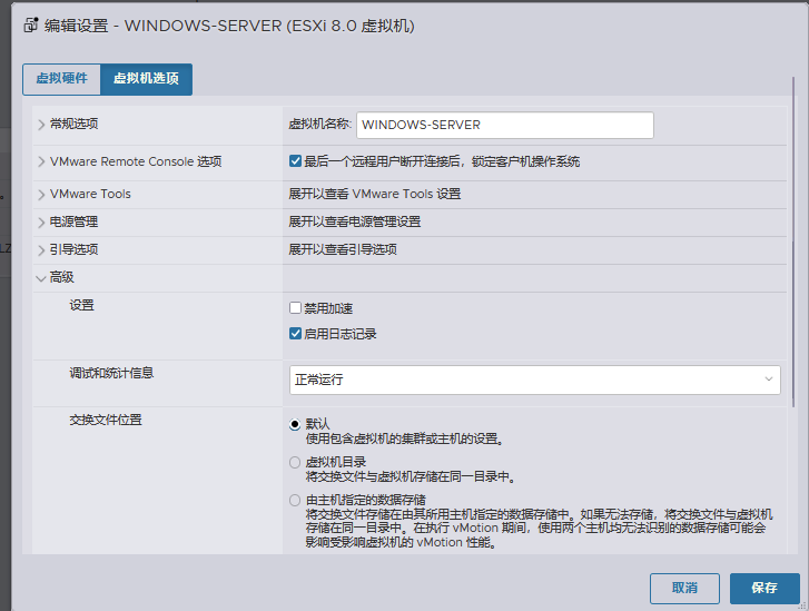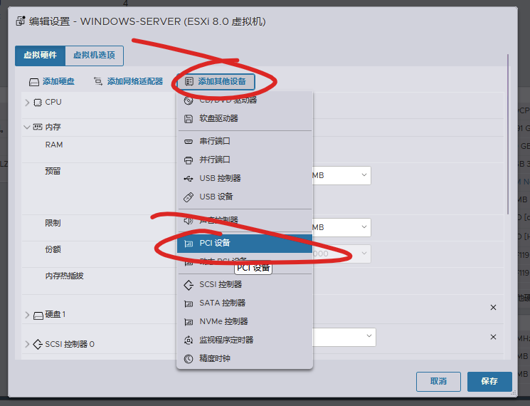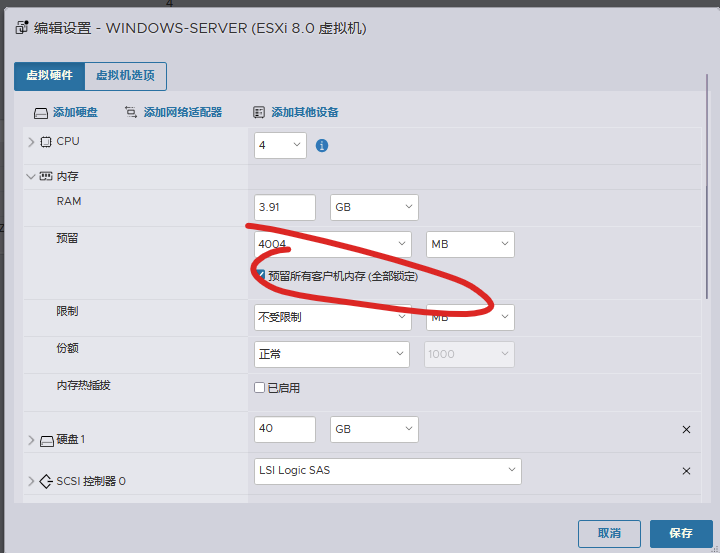 第一个操作:展开内存选项,勾选“预留所有客户机内存”(不进行预留的话会导致虚拟机无法开机)
