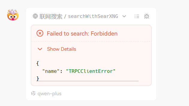 当LobeChat 调用searxng搜索报错Failed to search: Forbidden ,并且返回下面的值(TRPCClientError)