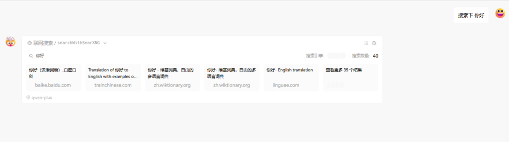 然后保存配置文件,接下来重启searXNG,再尝试使用lobechat调用大模型进行对话