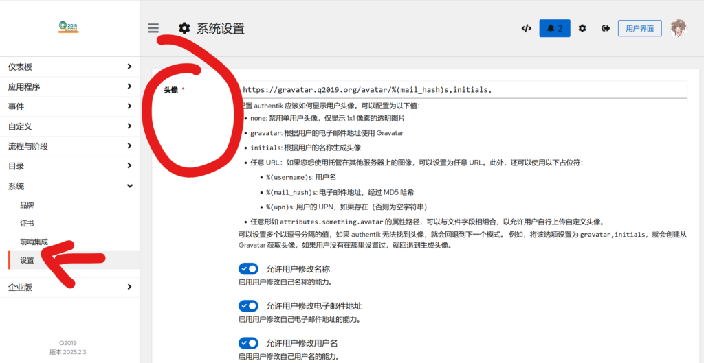 前往authentik的管理员的后台,在左侧的系统栏目中有一个设置栏目,点进这个设置的栏目,右侧就会出现头像设置,如下图