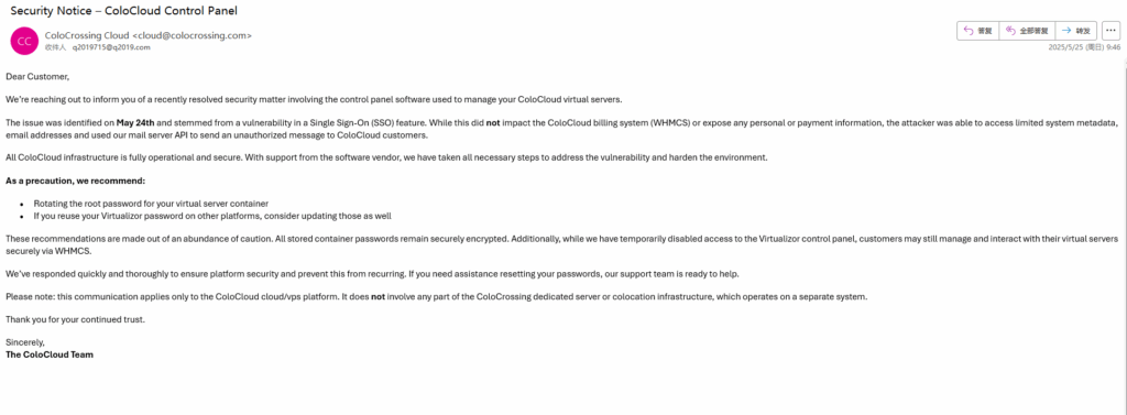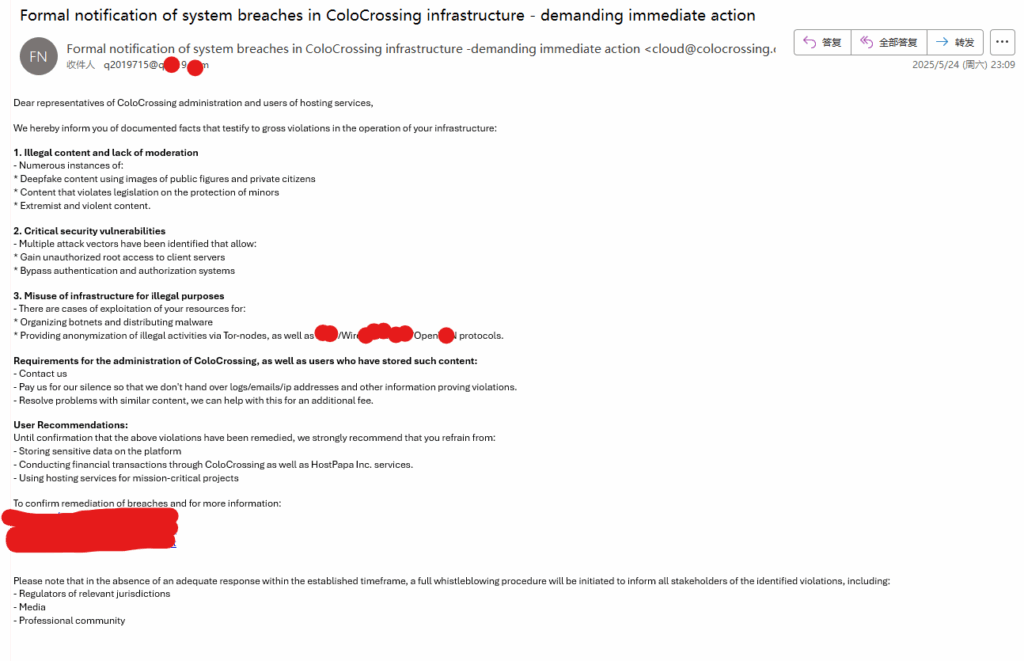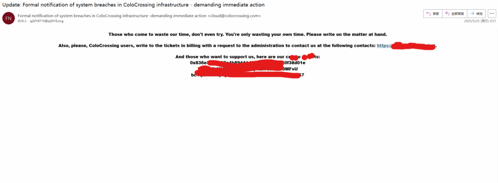 在那天(2025-5-24)中午我我收到了来自我购买云服务器的一个云服务器厂商colocrossing的三封邮件