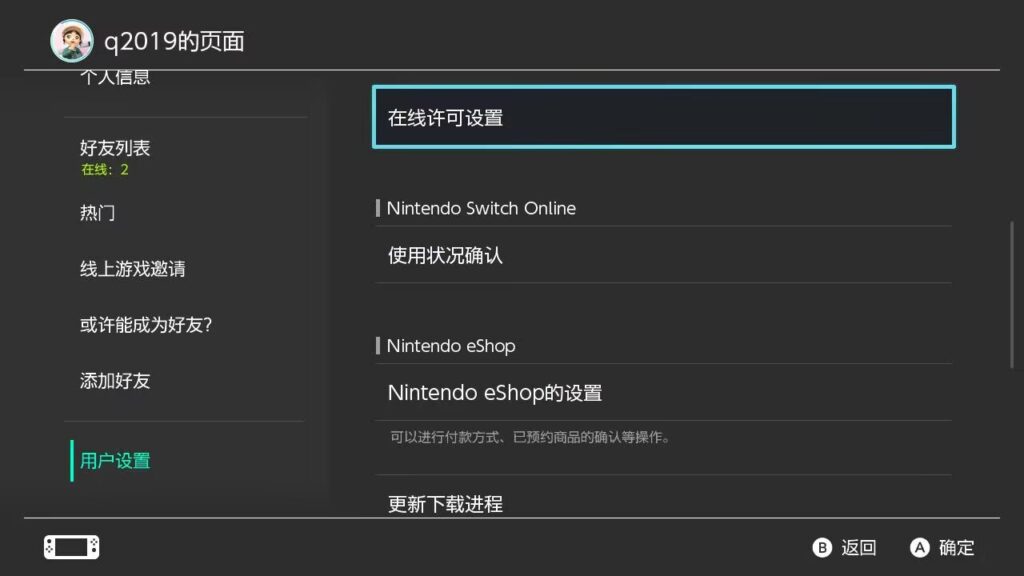 在switch的用户主页中,找到用户设置模块,然后点击如图10中的在线许可设置按钮。