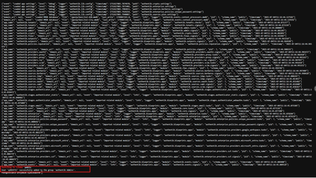 只要输出如图2中红框中圈出的内容“User 'q2019715' successfully added to the group 'authentik Admins'.”就代表成功了。接下来只需要登录这个账号 就可以重新拿回Authentik的管理员程序了。
