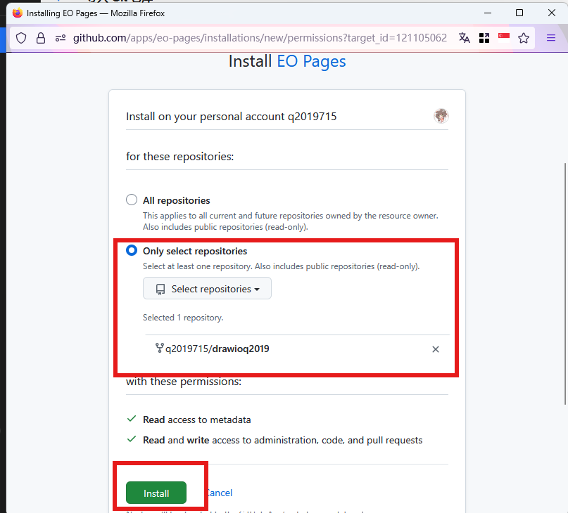 接下来授权后会弹出下面的界面,如图5所示,我们选中Only Select Repositories(最小权限原则,只授予需要的项目的访问权限给EdgeOne),然后选中我们刚刚fork的项目 ,点击install ,完成项目选择