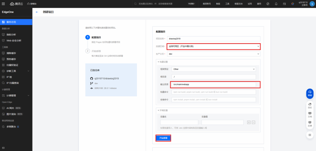 说完了Draw.IO,我们也要提到一下腾讯的PAGES功能。按照官方的说法:“EdgeOne Pages 是基于 Tencent EdgeOne 基础设施打造的前端开发和部署平台”。腾讯的这个跟GITHUB的PAGES很类似,都是可以部署静态网页的,而且都是免费的[1],并且腾讯的这个在国内访问速度比GitHub快多了。我们这次只用他的静态文件部署的功能。使用我这种方法部署的话,不仅没有服务器成本,而且速度也很快。