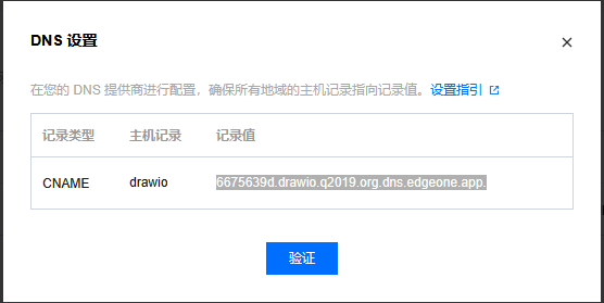 接下来会弹出对应的域名的CNAME解析记录,如图10,在我们的域名解析商那里添加对应的主机记录,然后点击验证按钮,完成部署.