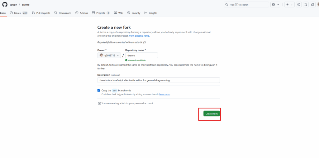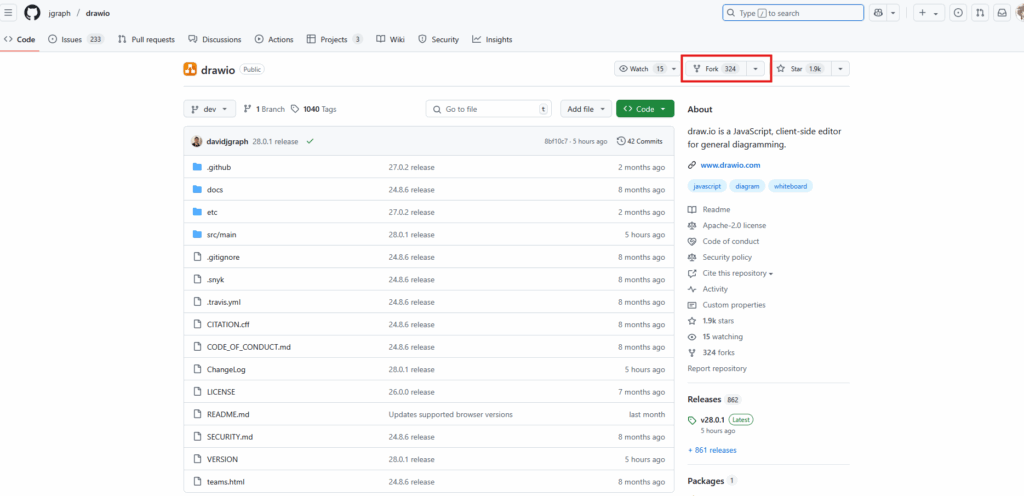 首先我们前往Draw.Io的官方项目仓库(链接:https://github.com/jgraph/drawio)然后点击Fork(如图1),将项目Fork到自己账号上