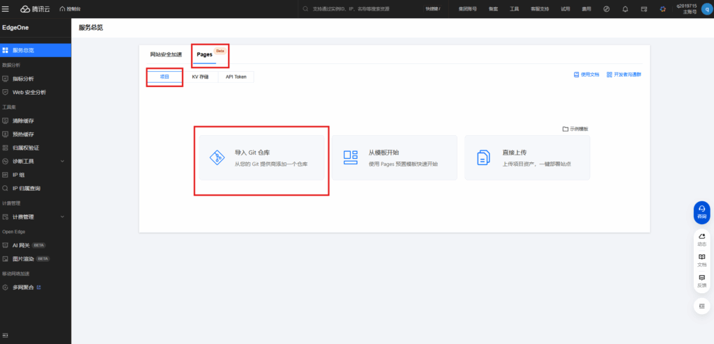然后点击Pages 再点击项目 点击导入Git仓库,如图3(请注意,不能选择直接上传,因为腾讯EO Pages有单次上传1000个文件的上限,而Draw.io文件超过了这个数量,只能使用导入Git仓库的方案)