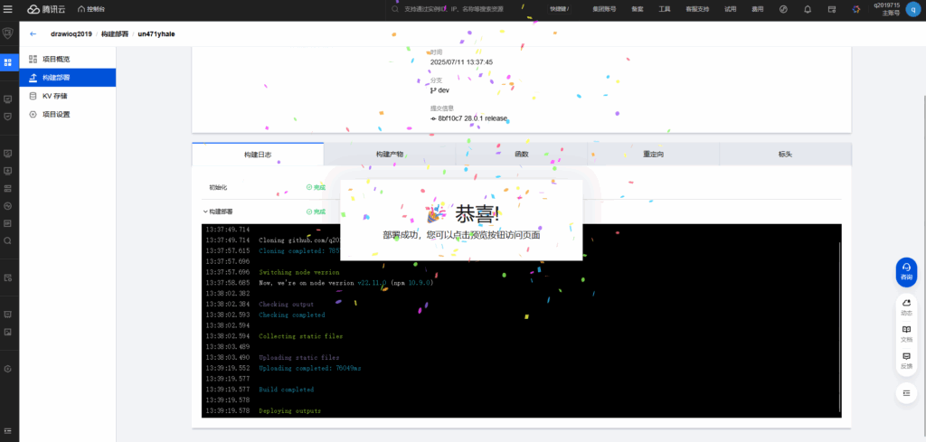 然后只需稍作等待,直到如图7中的界面中出现 恭喜 还有礼花动画 便代表部署完成了。